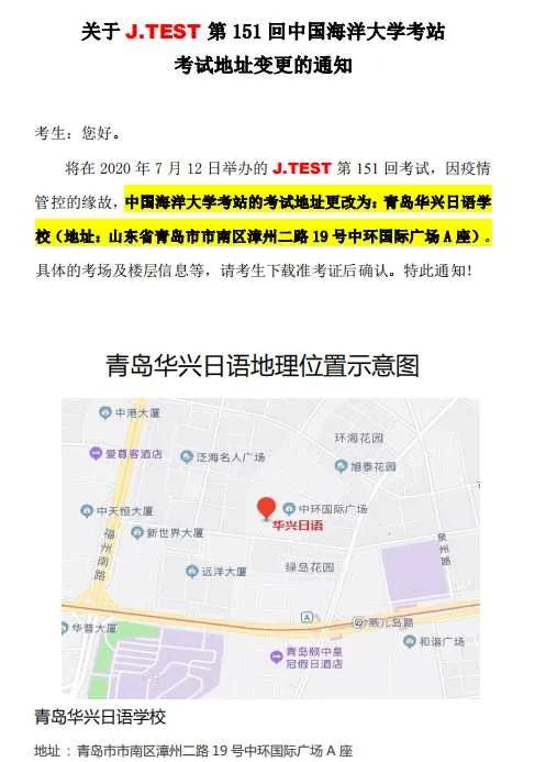 此次因疫情管控缘故,第151回J.TEST考试中国海洋大学考站的考试地址变更为青岛华兴日语学校。
